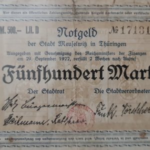 Germany / City of Meuselwitz (Thuringia) (Federal state of Thuringia) 500 marks vf currency note