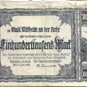 Germany / City of Mülheim an der Ruhr (Prussian province of Rhine) 100 000 marks vf currency note