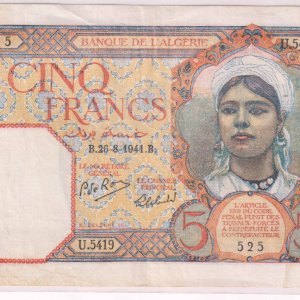 French Algeria – 5 francs 1941 vf+ currency note