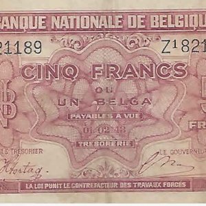Belgium Kingdom in exile – 5 francs 1943 used currency note w/holes