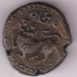 Vijaya Nagar – Feudatory chief , Fore paw raised lion, copper coin F1