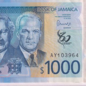 Jamaica – 1000 $ 2022 vf polymer currency W/ fold