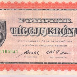 FAEROE ISLANDS – 10 kronur 1949 used currency note