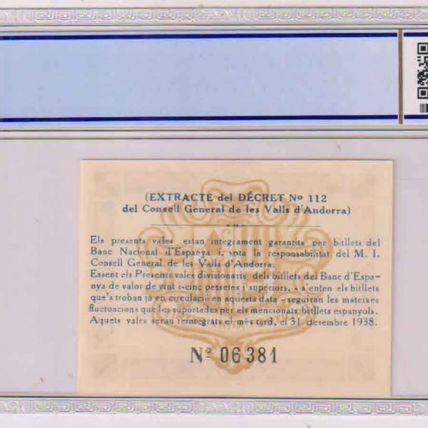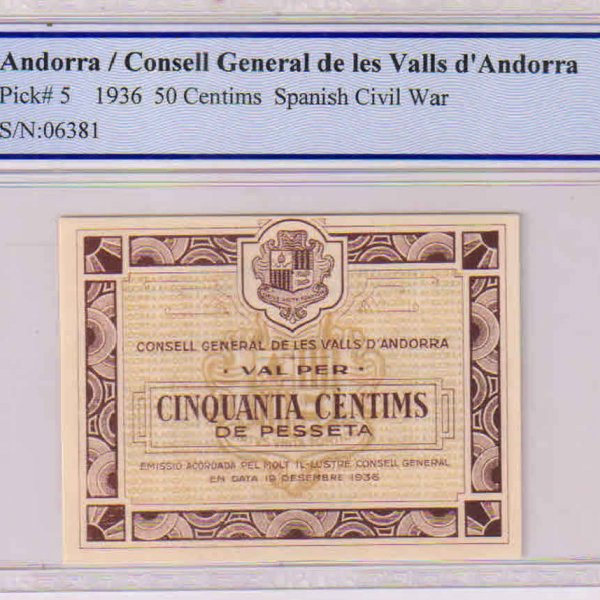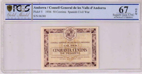 Andorra – 50 cents 1936 very rare unc 67 graded currency note xxx