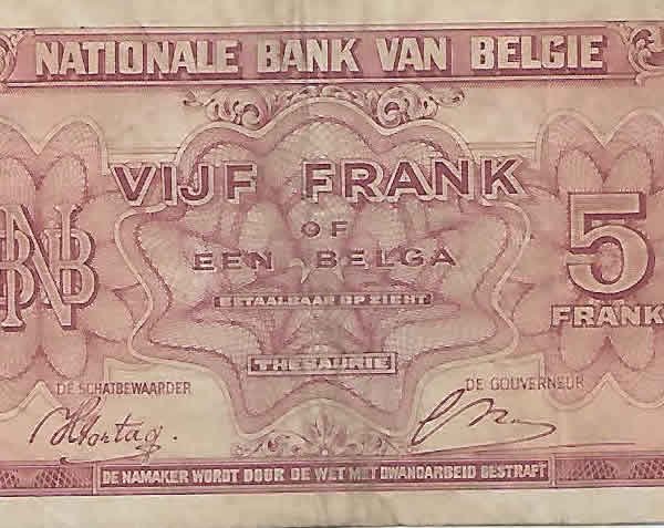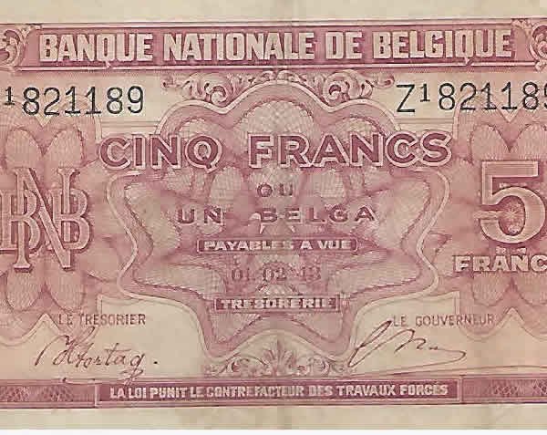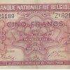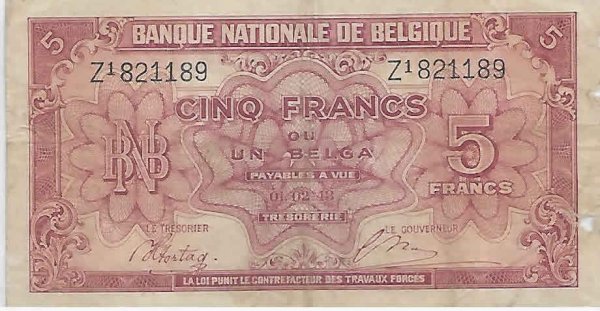 Belgium Kingdom in exile – 5 francs 1943 used currency note w/holes