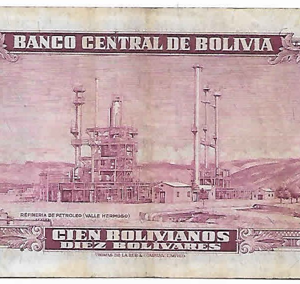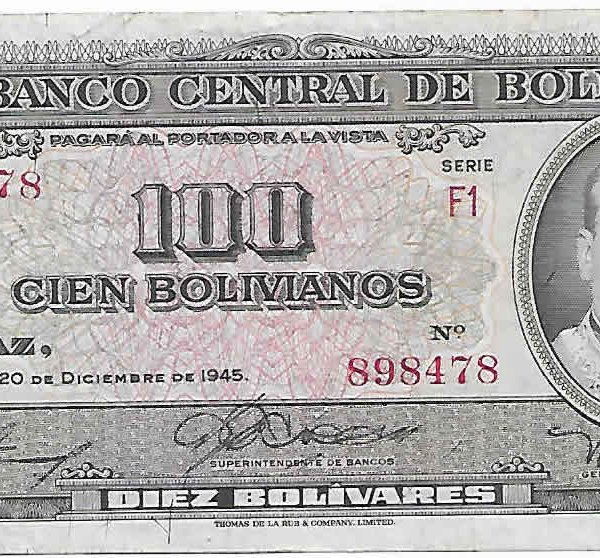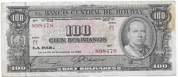 Bolivia 100 bolivianos 1945 vf currency note w/ stain