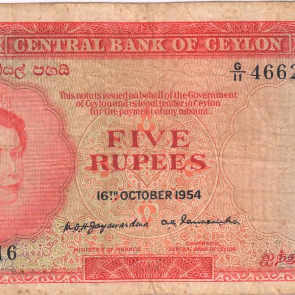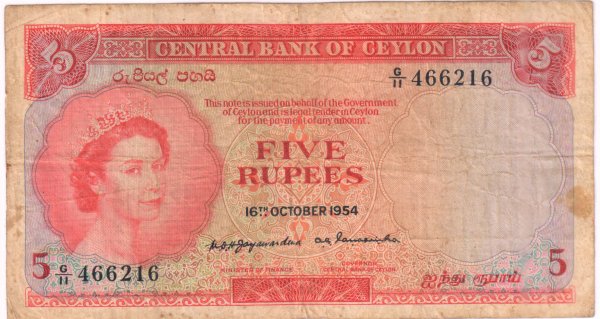 British Ceylon – 5 rupees 1954 scarce currency note