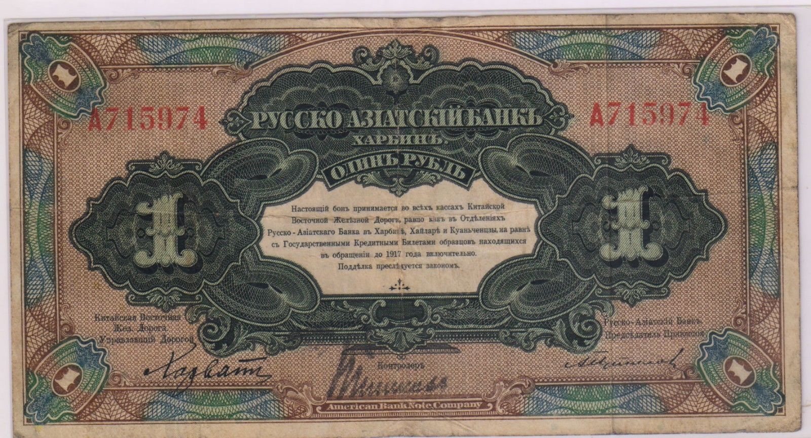 China/ Harbin / Russia Asiatic Bank, 1 ruble 1917 , used currency note