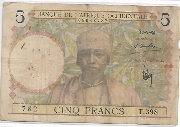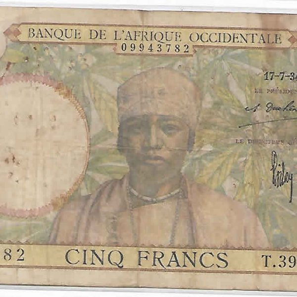 “DAKAR” FRENCH WEST AFRICA – 5 francs 1922 used currency note w/ holes