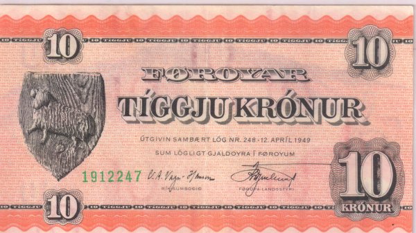 FAEROE ISLANDS – 10 kronur 1949 used currency note