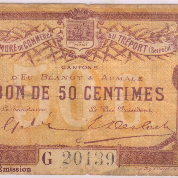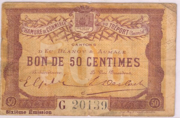 France , Chamber of commerce Blangy and Aumale , 50 centimes 1919 Vf- currency note