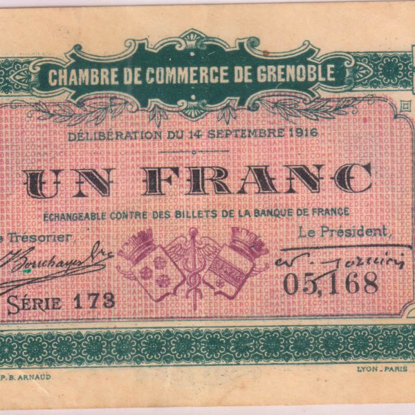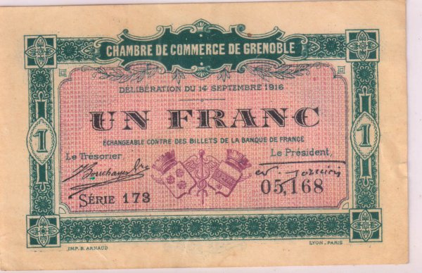 France chamber of commerce GRENOBLE 1 franc 1916 xf currency note