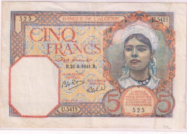 French Algeria – 5 francs 1941 vf+ currency note