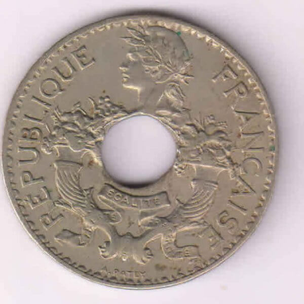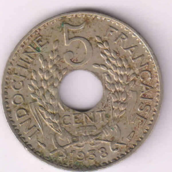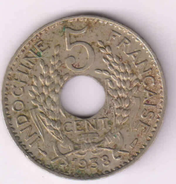 French Indo China – 5 cents 1938 KM 18.1a 4 gms n.brass holed coin quantity