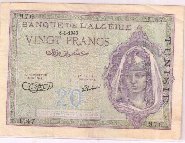 French Tunisia – 20 frs 1943 vf currency note