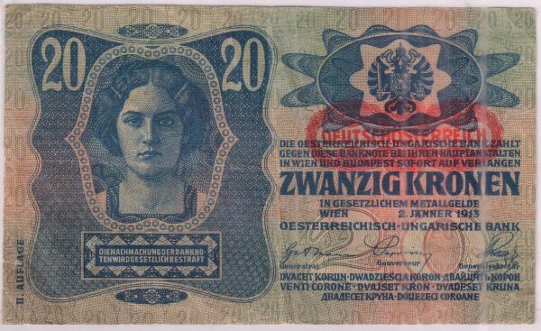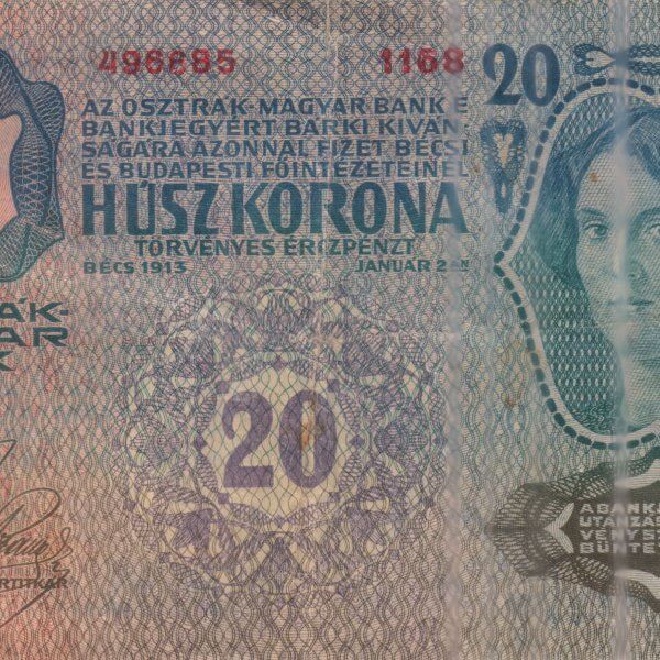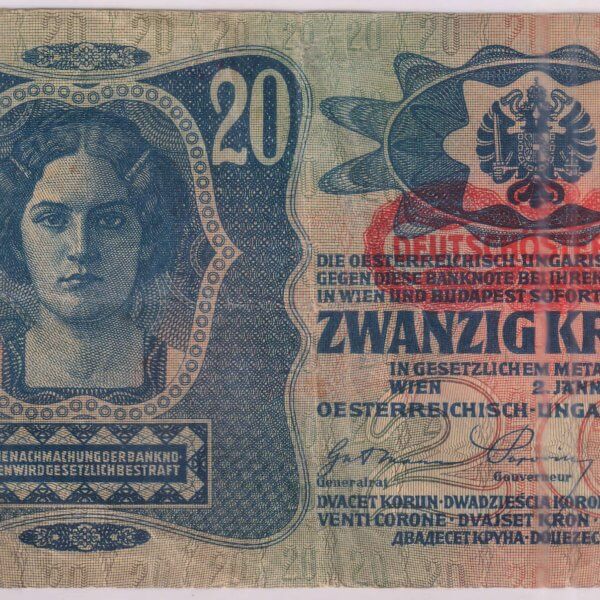 German occupied Austro Hungary – 20 kroner 1913 vf currency note