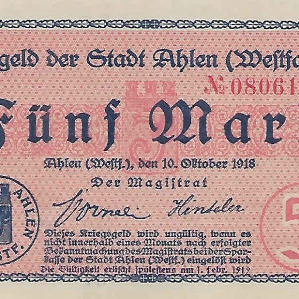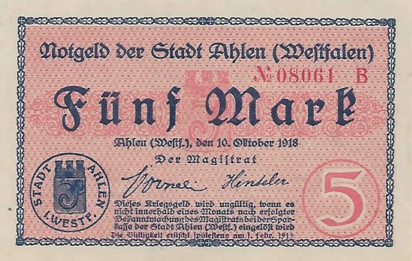 | Issuer | City of Ahlen (notgeld) (Prussian province of Westphalia) |