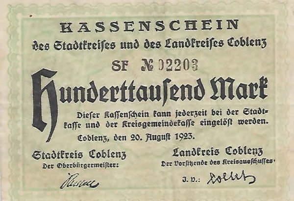 Germany / Districts of Koblenz (Prussian province ) 1923 vf currency note