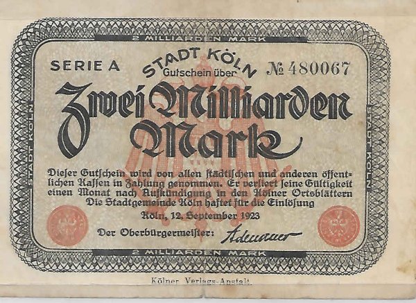 Germany Koln notgels 2 000 000 000 marks1923 vf currency note