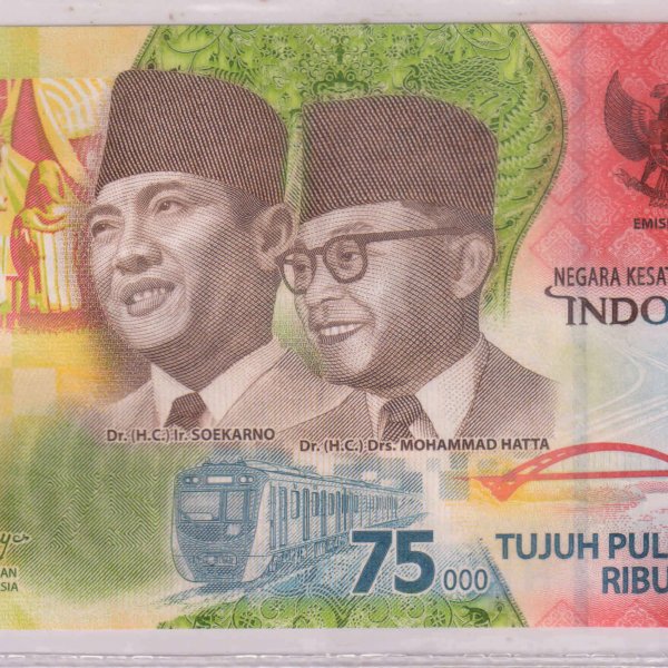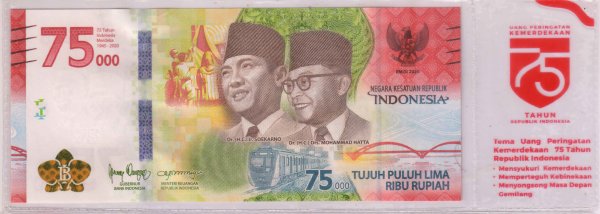 Indonesia 75000 rupiah 2020 unc currency note (Commemorative issue 75 Years of Independence. ) w/ official Pouch quantity
