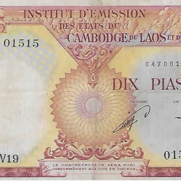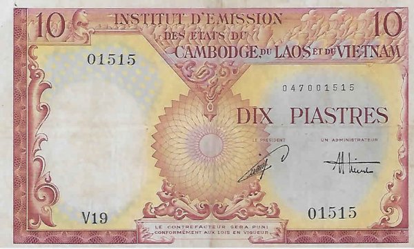 French Indochina states of Cambodia, Laos and Vietnam ( Vietnam issue ) 1953 10 piastres vf scarce currency note