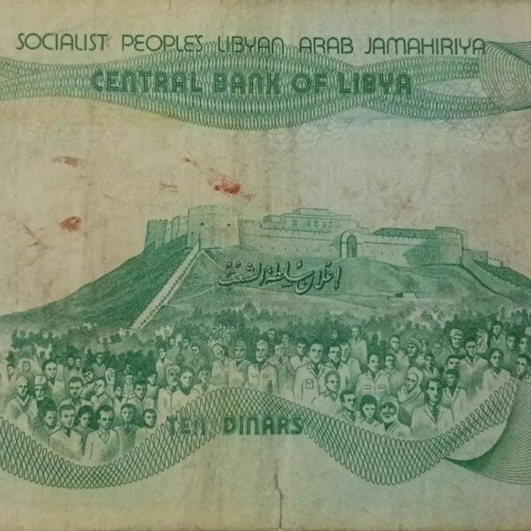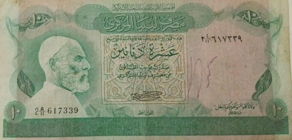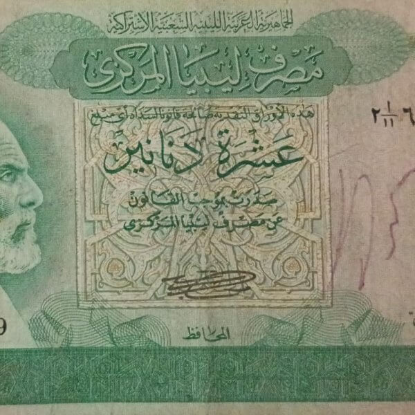 Libya – 10 dinars 1980 vf currency Note ( large note, torn)