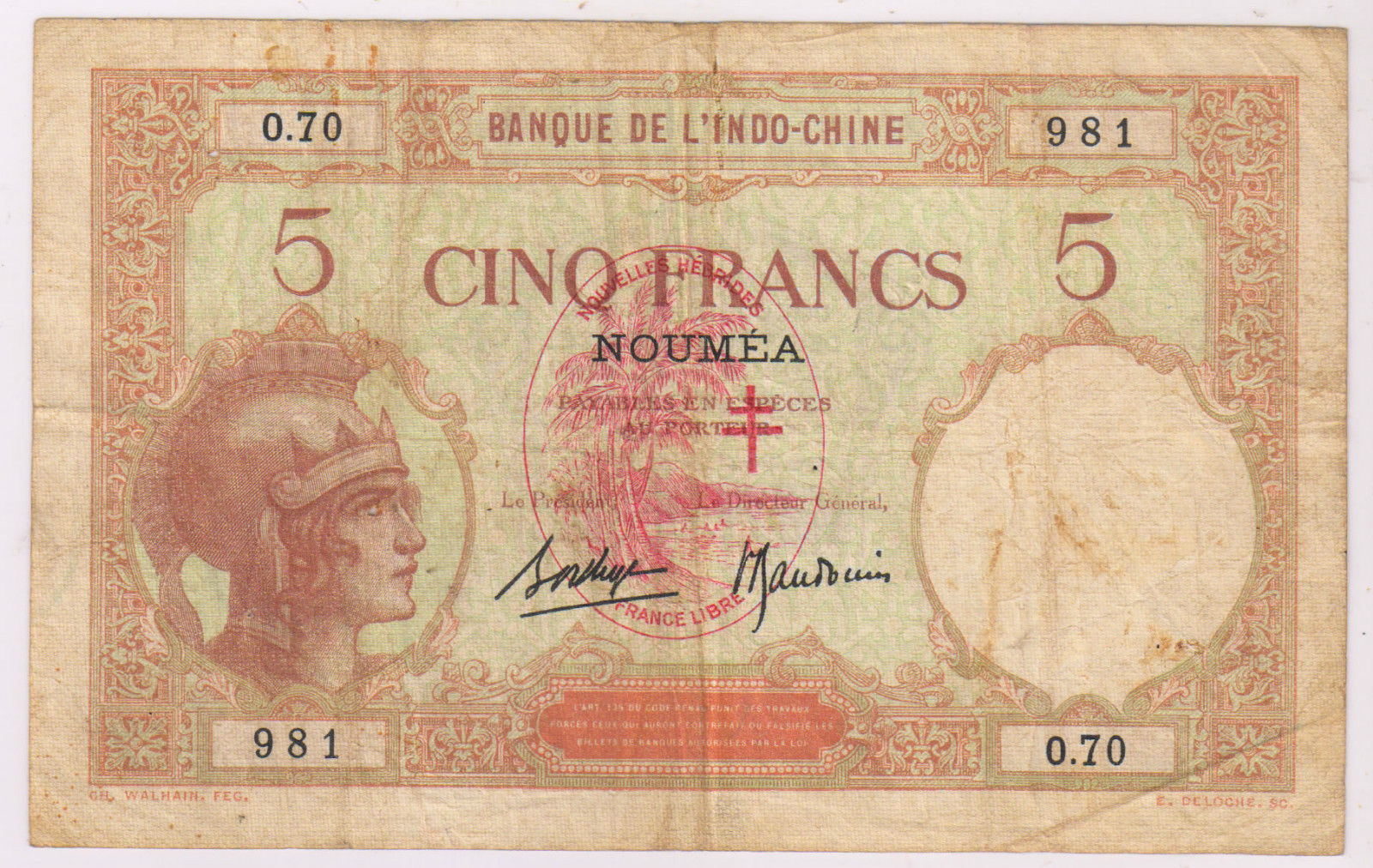 New Hebrides – 5 Francs 1941 scarce used currency note