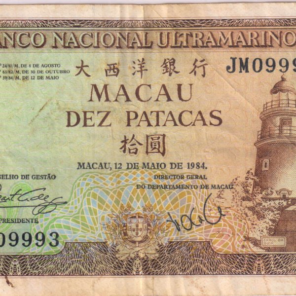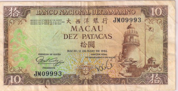 Portuguese Macau – 10 patacas 1984 vf currency note
