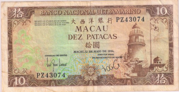 Portuguese Macau – 10 patacas 1984 vf currency note