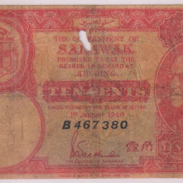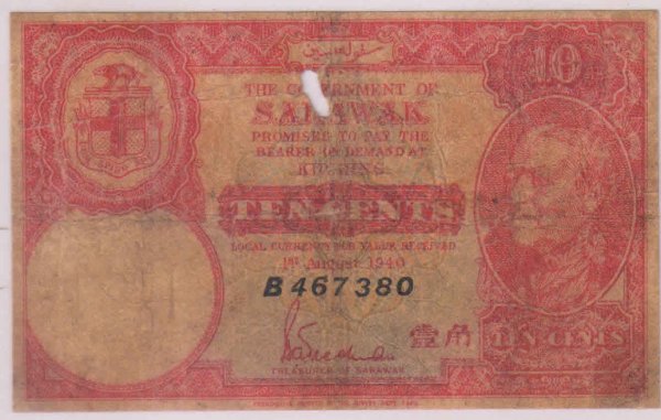 Sarawak – 10 cents 1940 , uniface scarce currency note ( w/holes & cropped edges) xxx