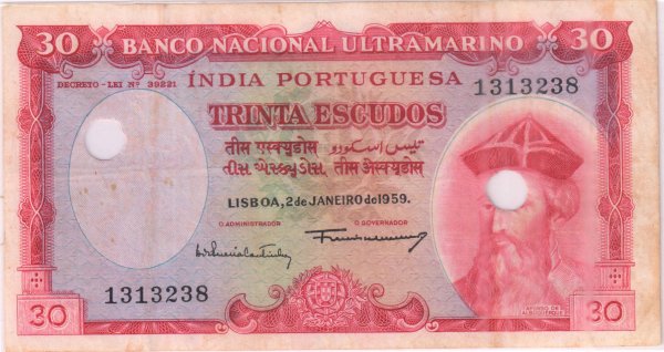 India portuguese – 30 escudos 1959 scarce currency note / Cancelled