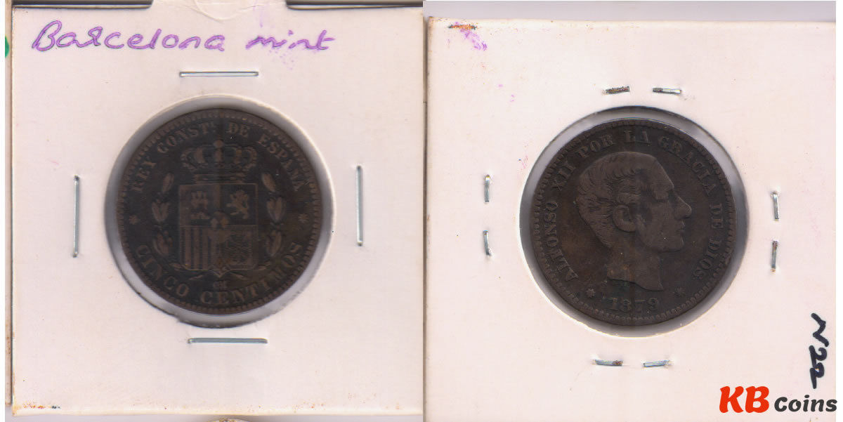 Spain ,Barcelona mint , 5 centismo 1879 scarce coin